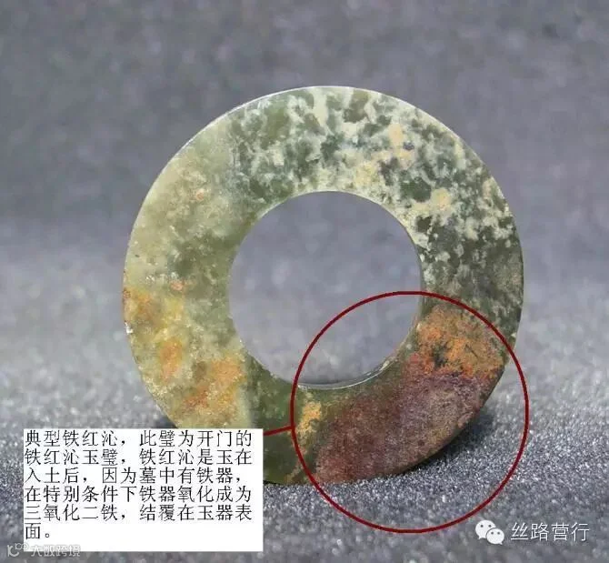 受铁或都土沁所致。受沁的程度有重有轻,重的地方还带有棕红或黑红的块状物。沁成这种程度需要千年以上的时间。