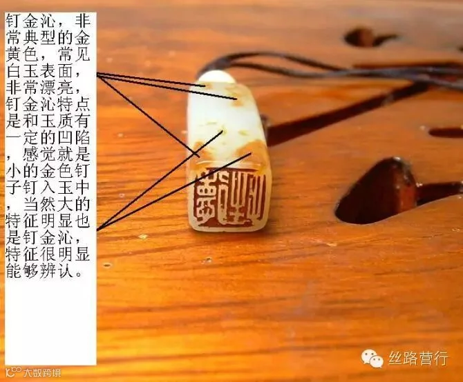 钉金沁的沁占呈钉子眼儿状,带色,抽坑,有棕色、紫色、灰色、黑色等,大都伴有线状凹陷。呈灰黑色或黑色的叫钉金水银沁。形成钉金沁至少需要1500年以上。