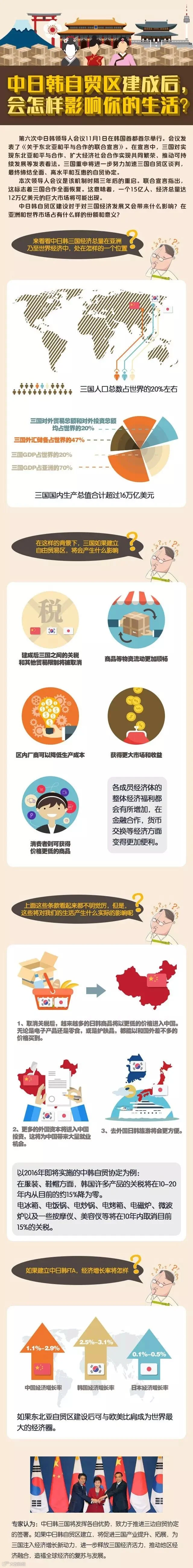 丝路营行2015年11月,时隔三年,中日韩领导人会议再度重启。中国总理李克强表示,要力争早日结束中日韩自贸区(FTA)和区域全面经济伙伴关系(RCEP)谈判。韩国总统朴槿惠呼吁,三国应加快韩中日自贸区谈判进程。日本首相安倍晋三也表示,三国应在签署投资协定的基础上,积极推进自贸区谈判。
