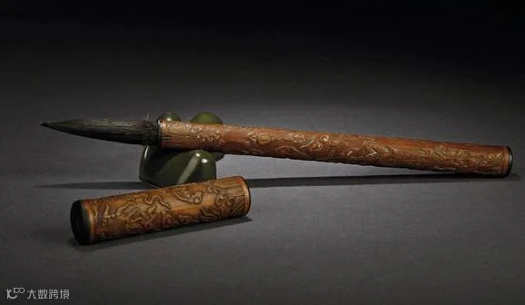 秀外慧中的竹制笔管 黑漆描金管黄流玉瓒紫毫(上图)管长16.8厘米、帽长8.8厘米、帽径0.9厘米,笔头紫毫制,形似兰蕊,根部饰黄色毫毛。笔管、笔帽均为竹胎髹漆,黑漆地上描朱绘云龙纹,笔管末端及笔帽两端分别描金回纹一周。管上端刻阴文隶书题“黄流玉瓒”四字,出自《诗·大雅·文王之什》中的“旱麓”诗:“瑟彼玉瓒,黄流在中。”诗赞周文王能承祖业,修德政,恭敬祭祀而得福气。古人用黑黍酿酒,以郁金草和之,则色黄味香,故称此种酒为“黄流”,在神祭活动中用以灌地。“玉瓒”则是神祭中舀酒之器。“黄流玉瓒”之铭取自古代的礼乐文化,体现了清代宫廷御用笔题铭中所蕴含之传统文化内涵。