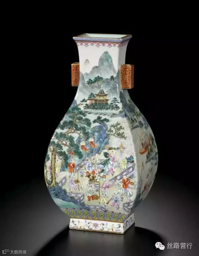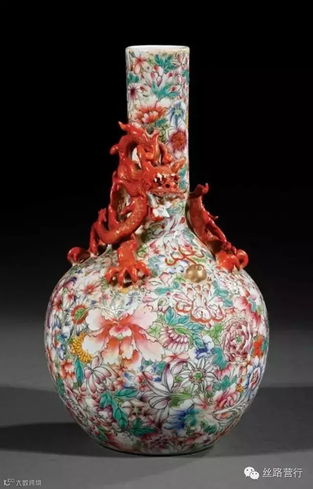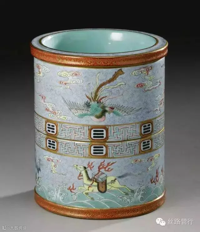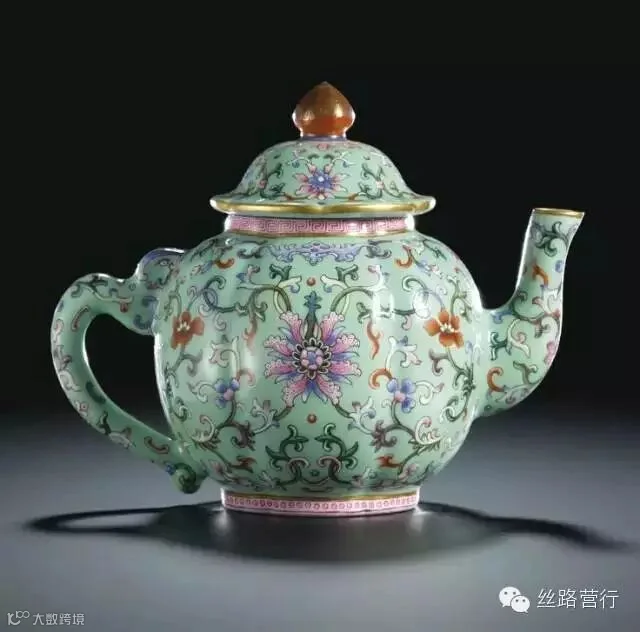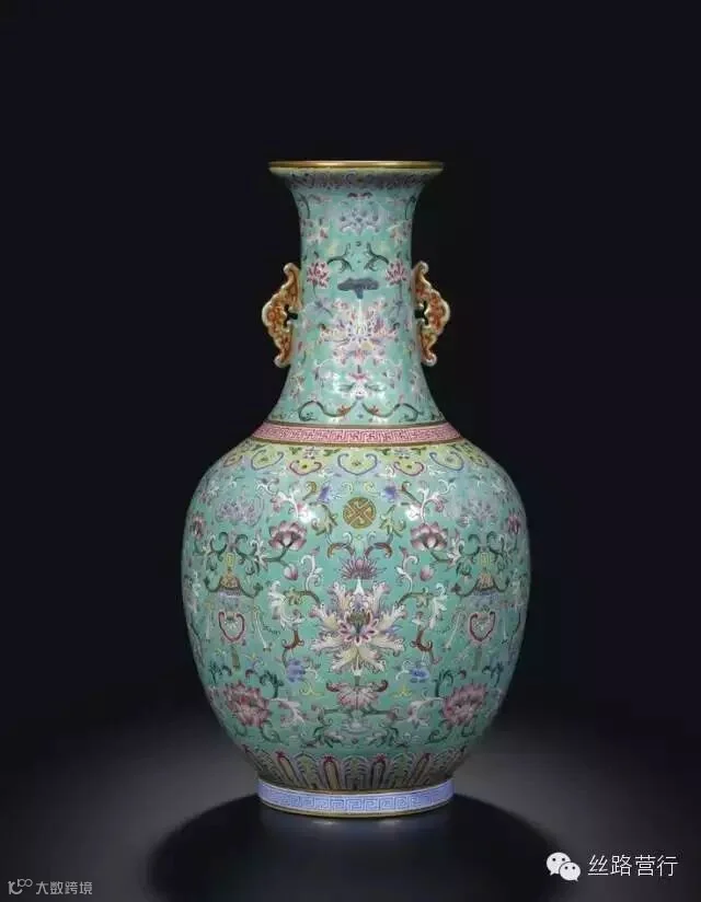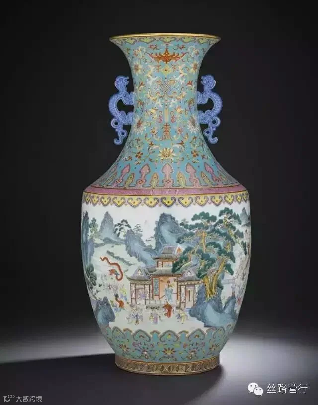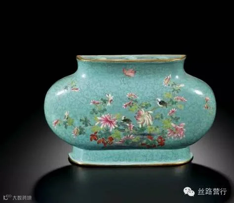 乾隆时期(1736 - 1795)为清代瓷器制作的鼎盛期,从乾隆开始,粉彩在彩瓷的领域中几乎完全取代了五彩的地位。乾隆粉彩有一个独有的特征,即器物口部及底部都施松石绿釉。松石绿釉浅淡光润,釉面犹如粥皮,由于是一种低温彩釉,釉面常常带有细小的纹片。这一特点乾隆时首先出现后,一直延用到晚清。