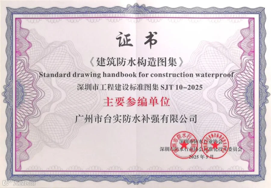 台实凭借深耕防水修缮领域的技术经验与工程实践,深度参与《建筑防水构造图集》编制工作,台实的技术标准与实践成果获得行业权威认可,同时也将企业技术优势转化为行业规范。