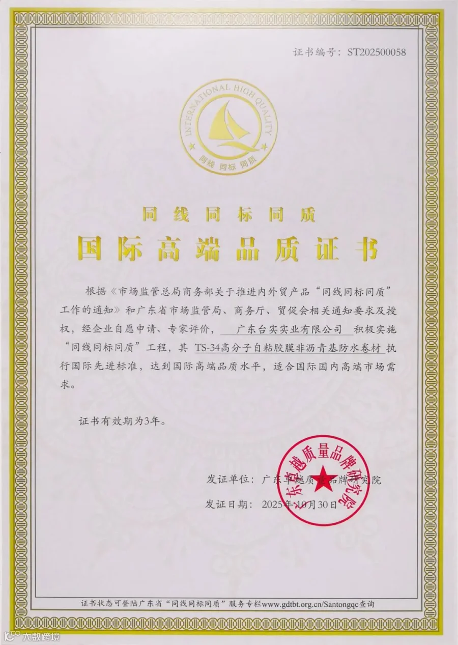 【荣誉资质】台实获“同线同标同质”国际高端品质认证