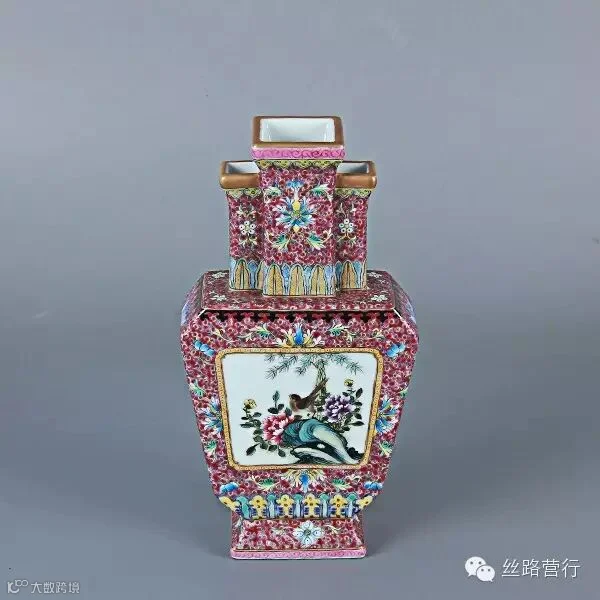 民国粉彩开光花鸟扁瓶
