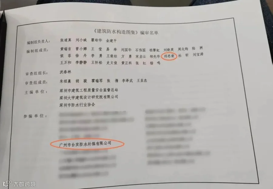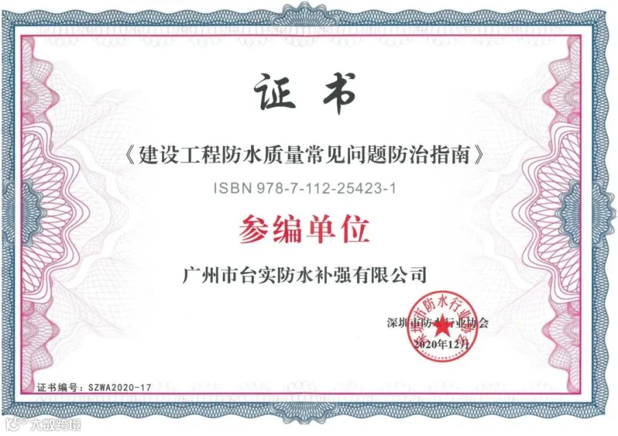 台实作为主要参编单位、邓思荣董事长作为主要参编人员,全程参与该《建筑防水构造图集》的编制工作,并获颁证书。这是对我司在图集编制中展现出的专业实力和积极态度的认可。作为中国建筑防水协会理事单位、深圳市防水行业协会副会长单位,台实以严谨的态度、专业的视角,将深耕建筑防水行业三十余年的施工经验融入其中,力求图集既紧跟行业发展步伐,又能切实指导实际工程,为提升建筑防水工程质量、推动行业健康发展提供有力的技术支持与参考依据。