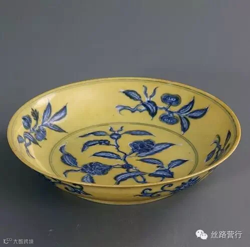 明代黄地青花折枝花纹盘