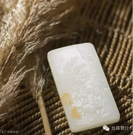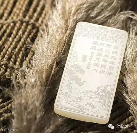 玉为材质,琢刻八匹骏马在湖畔休憩的场景。画面中,作者并没有刻意表现八骏飞驰的雄壮与气势,而是一反常态地着重刻画了近处的湖水和青竹,以此衬托八骏闲散时的自由与欢畅,同时,远处的群山和瀑布以粗略的几笔线条概括其形,以不全求全,使之意境更为深远,天宇更为广阔,开拓了整幅玉牌画面的表现力。