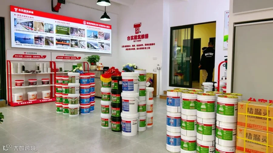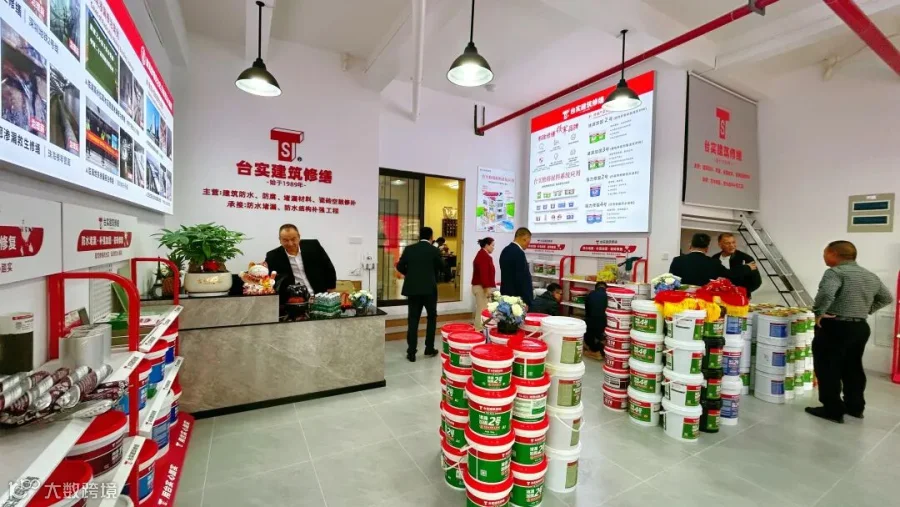走进门店,墙上的灯箱展示着台实系列修缮产品以及参与的部分经典工程案例,彰显台实专注建筑防水修缮三十余年的深厚底蕴。店内的商品陈列区错落有致,货架上摆放着各类新型的建筑修缮材料,让人一目了然。大家穿梭其中,不时驻足咨询了解台实产品的性能与应用范围。