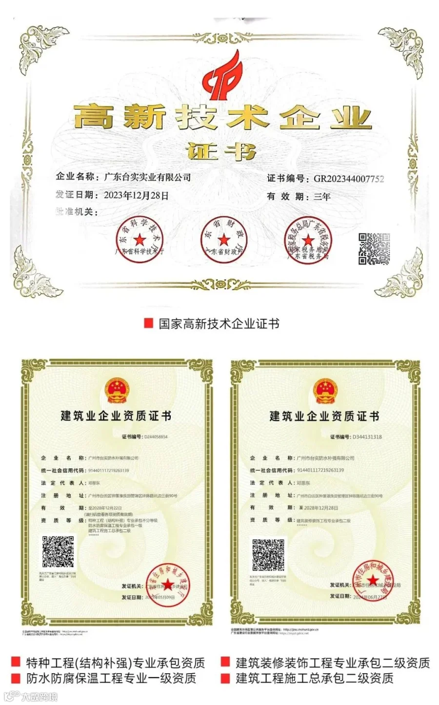 台实创建于1989年,是一家集建筑防水、修缮材料研发、生产、销售、工程施工与服务于一体的国家高新技术企业,下设工程服务公司:广州市台实防水补强有限公司。公司早年率先从中科院、高校引进和培育了大批专业人才,打造了标准化、规范化、专业化、创新型的研发、生产基地,拥有大批自主知识产权的高新技术产品和国家发明专利,产品、技术覆盖修缮领域,荣膺两项省级、一项市级“专精特新企业”荣誉称号。