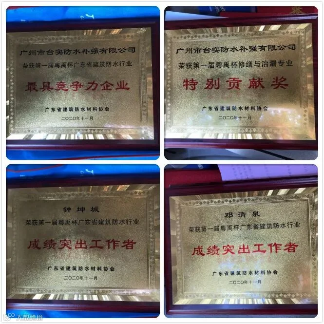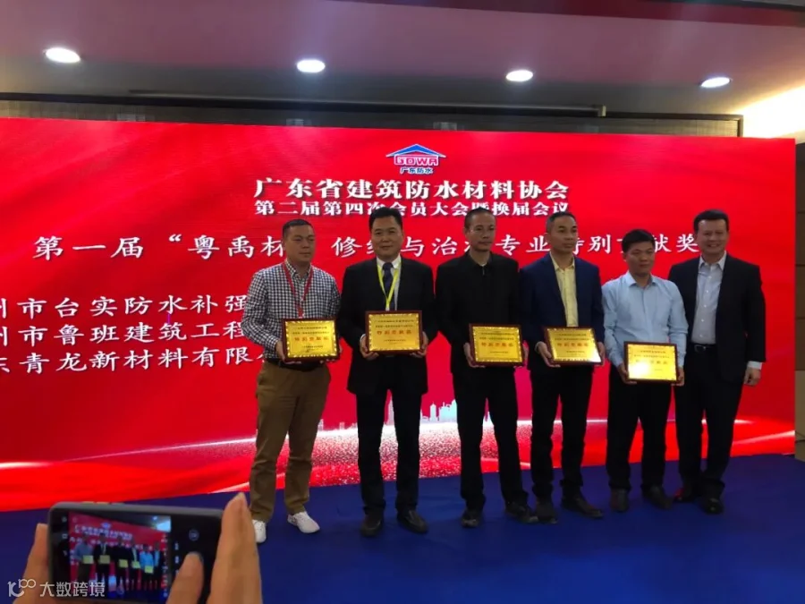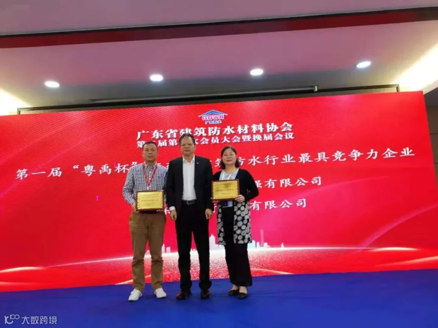 会上,广东省建筑防水协会对在广东省建筑防水行业第一届“粤禹杯”评比活动中涌现出的先进单位和个人进行了表彰,广东台实实业有限公司凭借突出的行业表现荣获“最具竞争力企业”和“特别贡献奖”、“成绩突出工作者”荣誉。