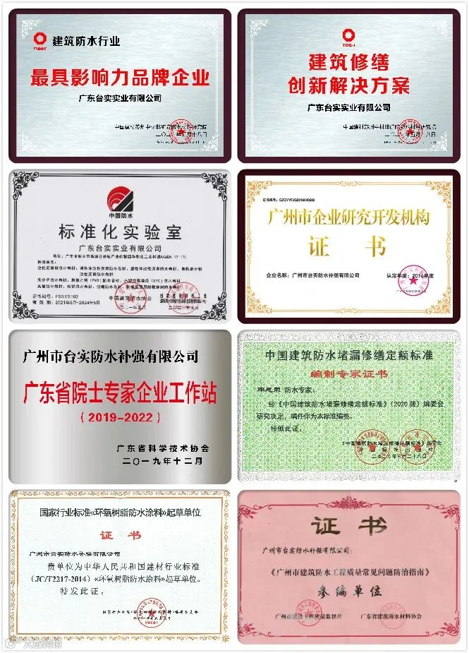 台实坚守建筑防水、建筑修缮行业三十余年,不断在竞争激烈的市场中探索绿色创新之路。经过多年的发展,公司在努力提升生产产能、技术实力和扩大全国营销网络、品牌影响力,建立台实修缮商学院及建筑防水职业技能培训基地,培育标准化工人,推动行业标准化施工,一步步打造“建筑系统诊治专家”的品牌形象。同时,台实获得“中国建材500强”、“广州市企业研究开发机构”、“工程技术研发开发中心”、“标准化实验室”、“建筑防水行业最具影响力品牌企业”、“高成长中小企业”、“广东省院士专家企业工作站”等荣誉认证,起草、参编了《中国建筑防水堵漏修缮定额标准》、《环氧树脂防水涂料》、《建设工程防水质量常见问题防治指南》、《深圳市建设工程防水技术标准》、《建筑防水材料老化试验方法》、《建筑防水系统构造参考图集》、《广州市建筑防水工程质量常见问题防治指南》等标准、规范、图集、书刊,与行业一起共成长、同进步。