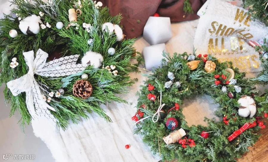 圣诞花环可以挂在门上,松枝与冬青叶编织出生命的绿意,大大的蝴蝶结是点睛之笔,再点缀些小彩灯、松果,自然与温馨完美融合。