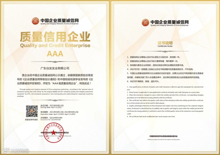 质量诚信是社会信用体系建设的重要内容之一,是推动质量发展、建设质量强国的基础。台实通过项目申报、资料评审、现场核查等层层筛选,最后荣膺最高等级称号,是对其在综合指标、经营发展、信用记录等方面的高度认可。