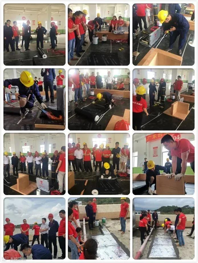 接下来,全体人员到达台实培训实操教室,由总经理助理邓景峰宣布实操培训开始。资深防水培训师王立信从施工方法、工艺等方面分别进行实操教学,对学员们进行了SBS防水卷材热铺施工、非固化SBS卷材粘铺施工和高分子卷材施工的实操培训。