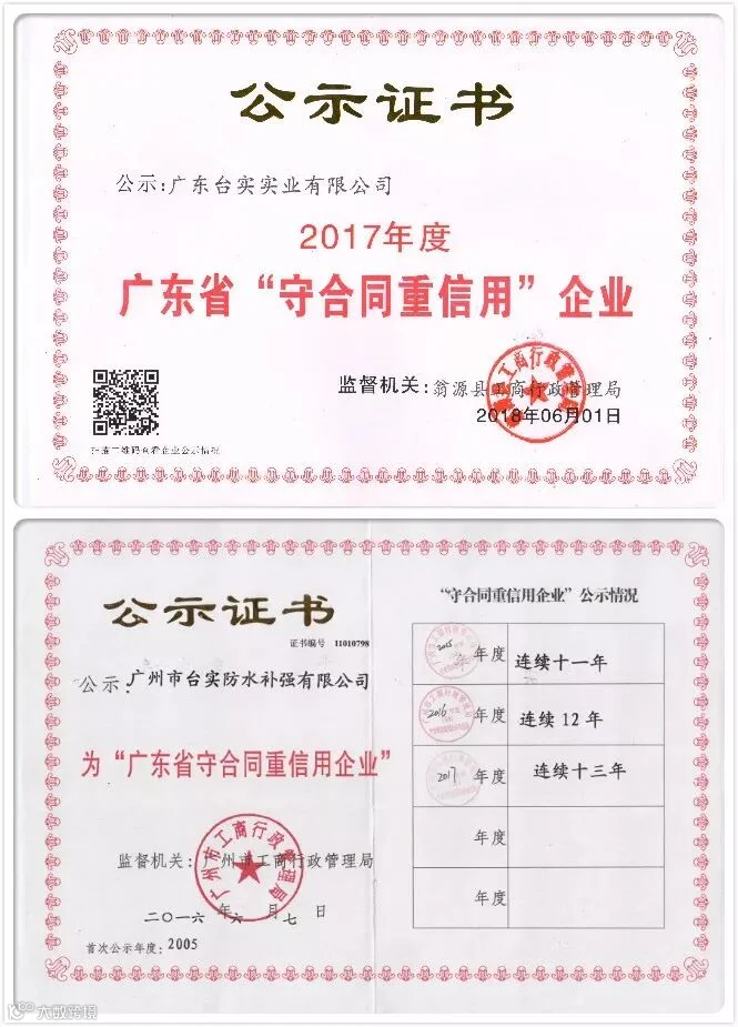经过几个月的严格评审,台实防水最终通过广州工商行政管理局和翁源县工商行政管理局的审核,再次被评为“广东省守合同重信用企业”,这已经是台实防水连续十三年获得此项荣誉,也是对台实防水诚信经营、追求卓越品质和长期不懈努力的认可。