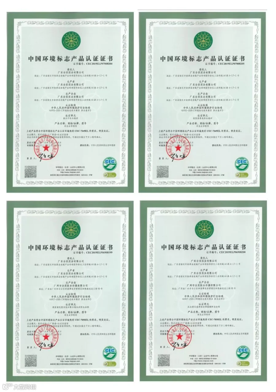 台实防水生产的高分子防水卷材、SBS改性沥青防水卷材、JS复合防水涂料和单组份聚氨酯防水涂料等多个系列防水产品顺利通过中国环境标准产品认证(简称“十环认证”)。