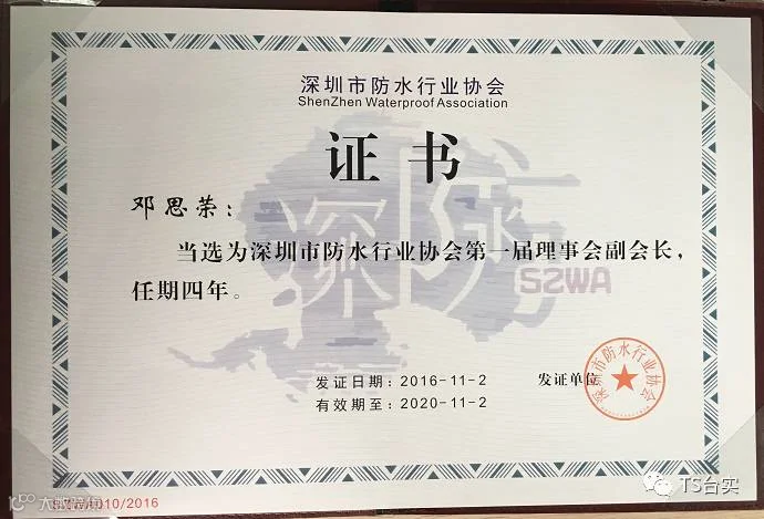 台实当选为深圳市防水行业协会第一理事会副会长单位,任期四年。同时获得了协会颁发的“突出贡献奖”,这不仅是我们台实防水的一种荣誉,更是对台实的信任、肯定及寄予厚望。今后台实将继续在防水行业肩负这一份责任,秉承工匠大师的精神去做防水,为实现企业愿景和社会使命努力奋斗!