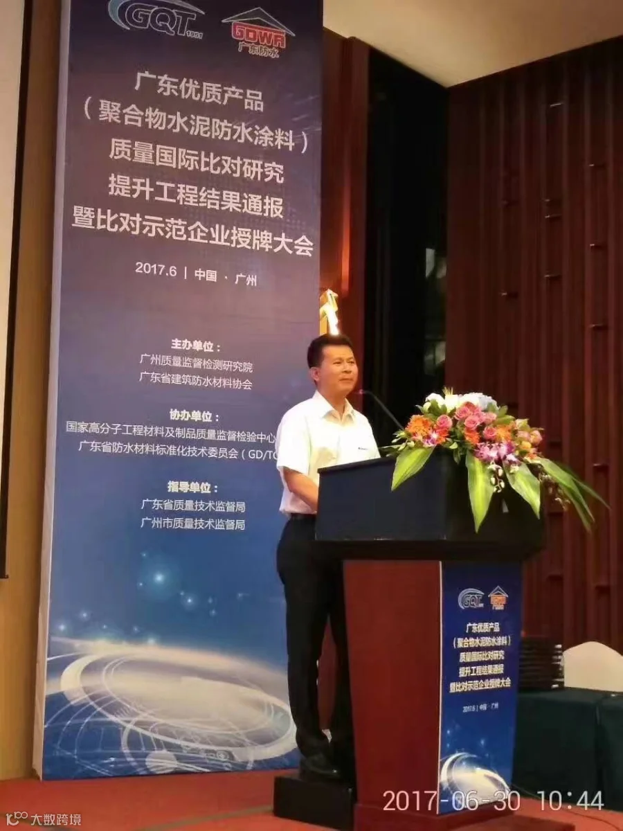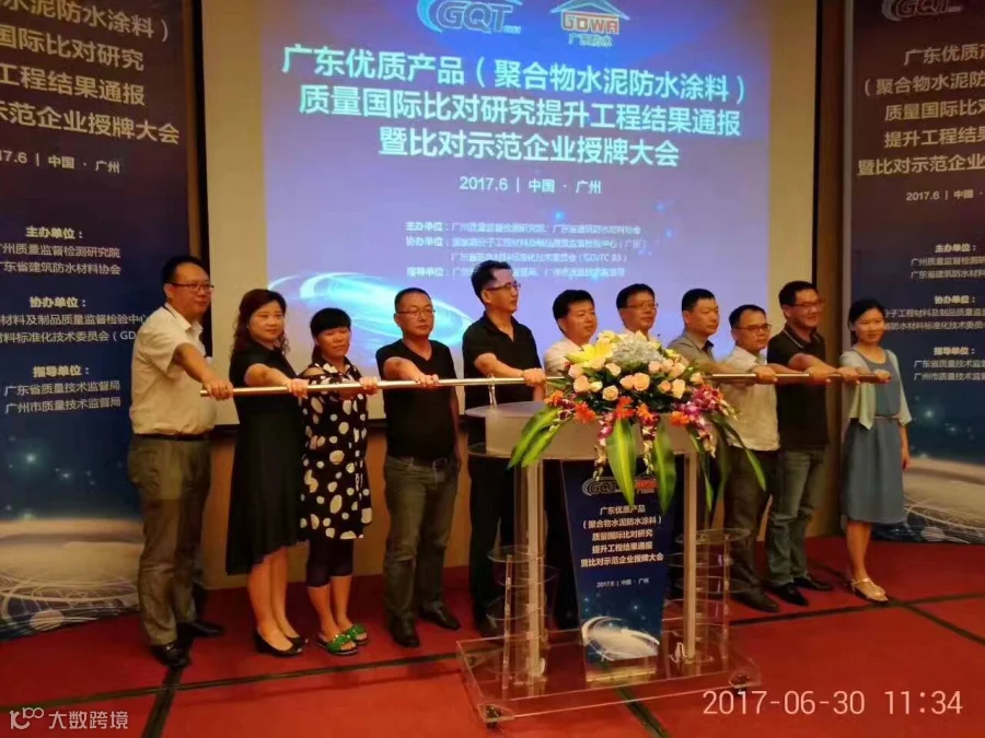 台实公司被授予广东优质产品质量国际比对研究提升工程--聚合物水泥防水涂料类质量比对研究提升示范企业”称号。授牌大会于30日下午在中信广场隆重举行,会上邀请了广州质量监督检测研究院刘春生副院长、中国建筑防水协会瞿培华副会长、广东省建筑防水材料协会张泳东会长为主礼嘉宾启动广东聚合物水泥防水涂料团体标准启动仪式,并为示范企业授牌。我司邓思荣董事长上台接受授牌并参与标准启动仪式。