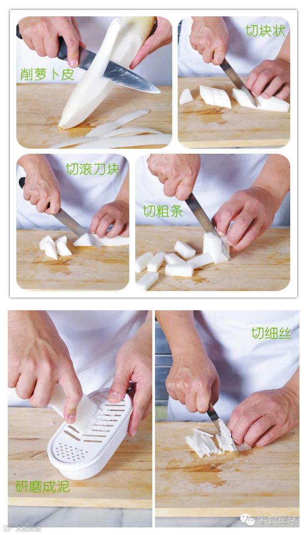 切白萝卜的时候可以考量搭配的食材大小,选择相似的刀工切出大小相似的形状,这样料理才会好看,食用夹取才方便,烹调至熟的时间也才能相近。