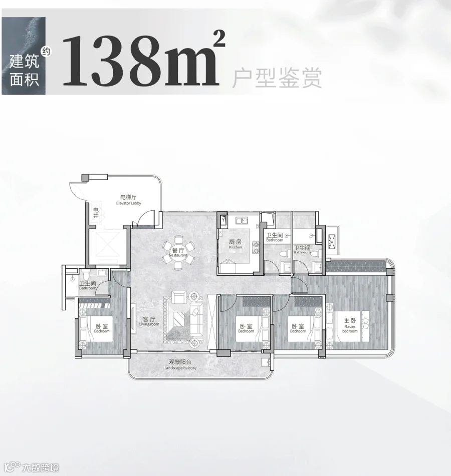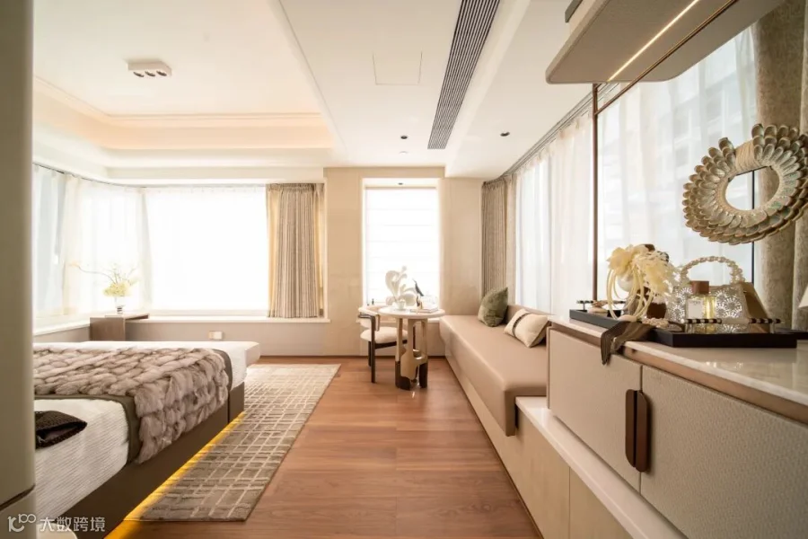 即便是约138㎡的四房户型,也大胆创新地设计了双主套格局。约18.4米南向面宽、约27㎡主卧配三面转角飘窗,这些曾经只出现在300㎡以上豪宅的配置,如今成为这里的标配。