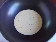7:平底锅开小火,稍稍预热,抹一层薄油。