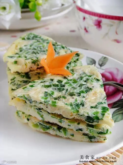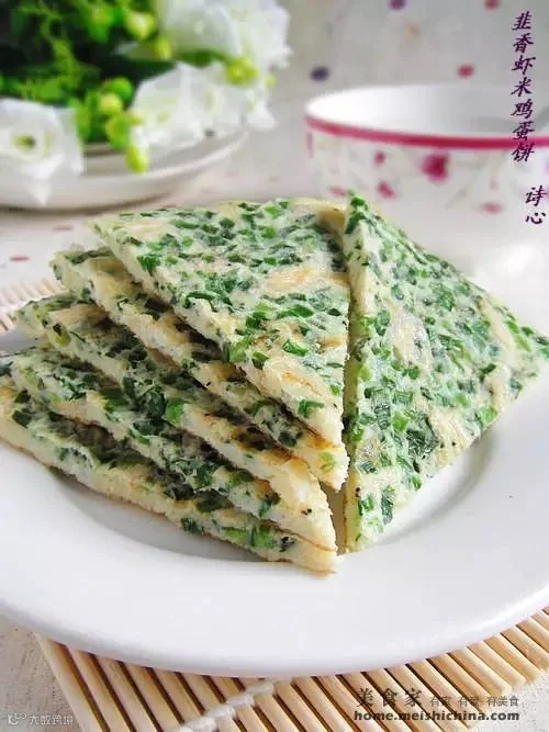 韭菜虾米蛋饼配上一碗白米粥,方便快捷,营养丰富。