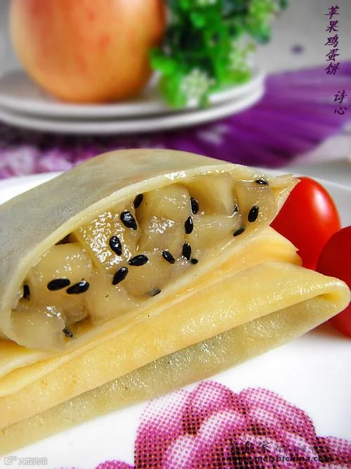 4:要在蛋皮表面刚凝固的时候铺上苹果,这样才能把对折后的蛋皮牢固的粘合。