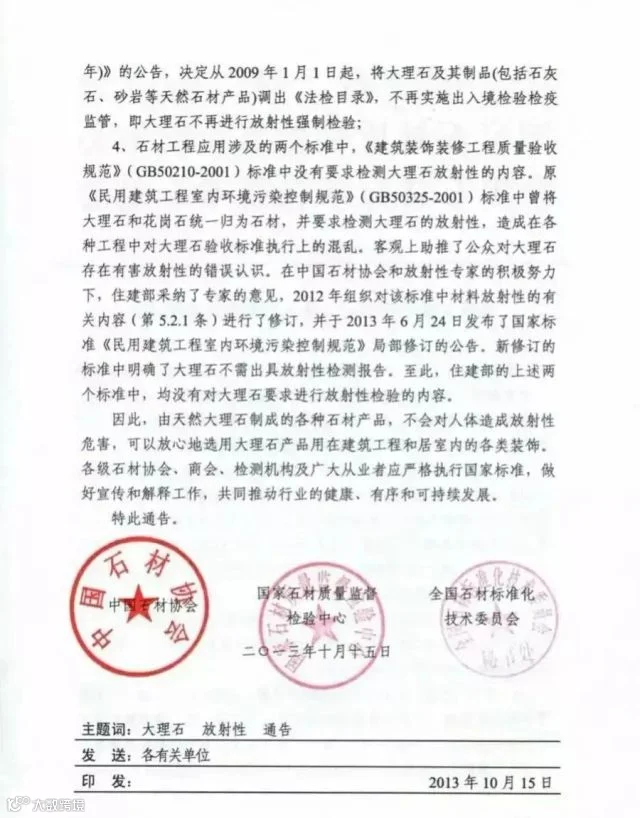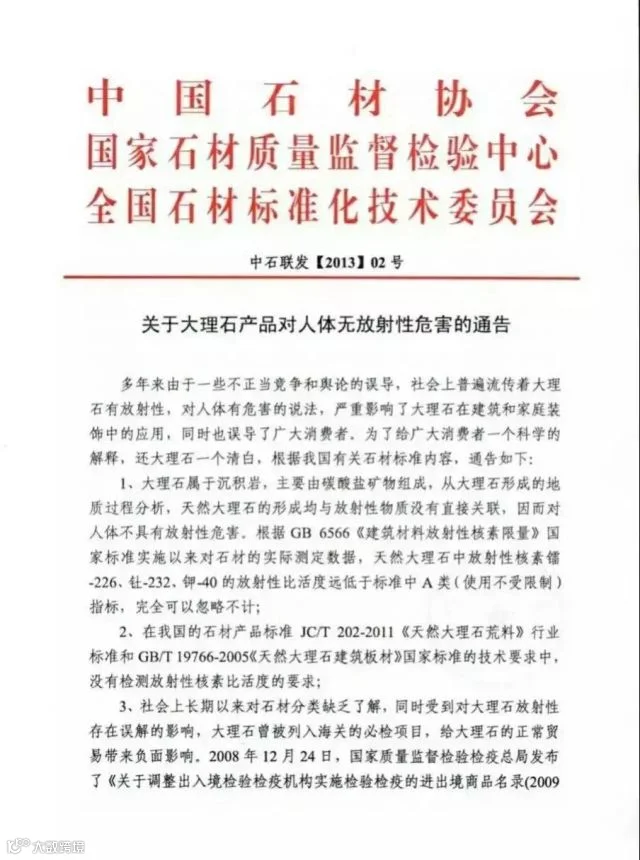 在2013年中国石材协会、国家石材质量监督检验中心、全国石材标准化技术委员会发表的一项通告显示: