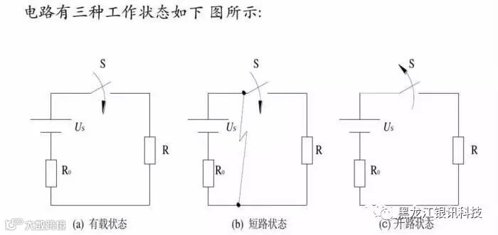 (c)开关S断开或电路中某处断开,切断的电路中没有电流流过,此时的电路称为开路。开路又叫断路,断开的两点间的电压称为开路电压。
