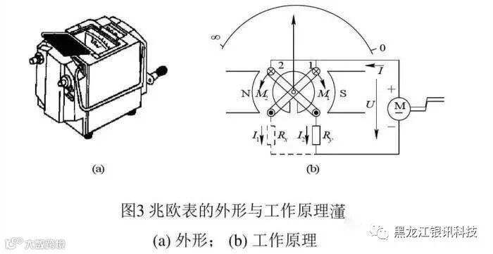 兆欧表(又叫摇表)是一种简便、常用的没量高电阻的仪表,主要用来检测供电线路、电机绕组、电缆、电器设备等的绝缘电阻,以便检验其绝缘程度的好坏。常见的兆欧表主要由作为电源的高压手摇发电机和磁电式流比计两部分组成,兆欧表的外形与工作原理如图3所示。