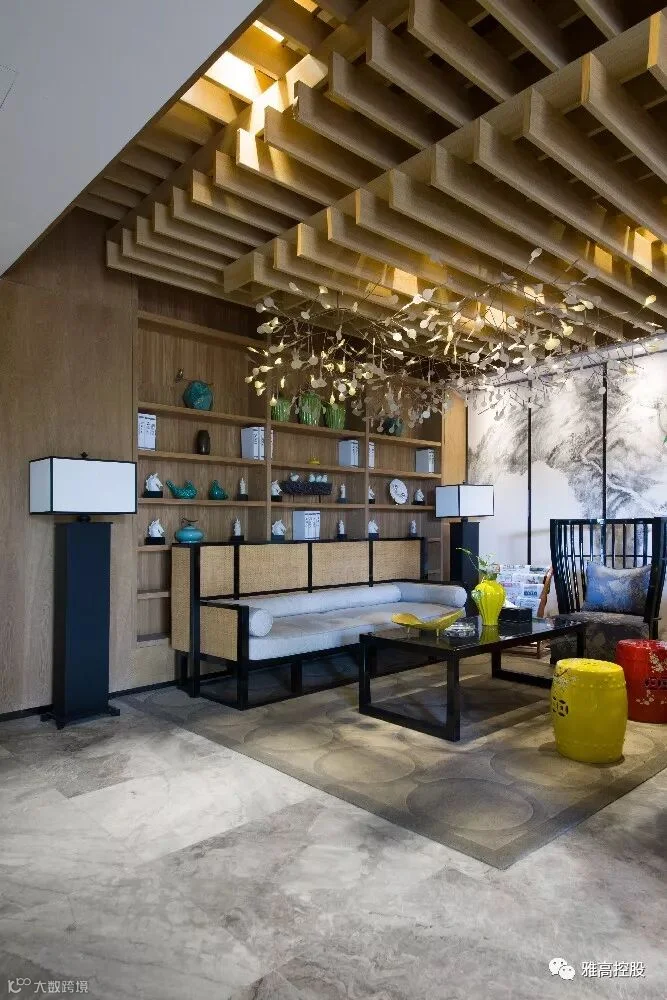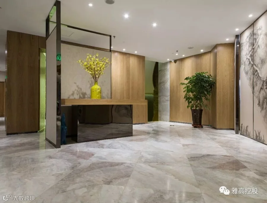 雅高大纹理的锦玉大理石质地细腻、气质高雅、灵动如诗,与自然原木搭配给人自然亲近感,软装装饰以极富中国文化特色的屏风、瓷器、水墨画等为主,给人一种历史文化深厚之感,每个角落都营造出雅致古韵的气质,给消费者提供一个放松身心和情感交流的体验平台。