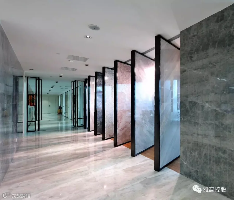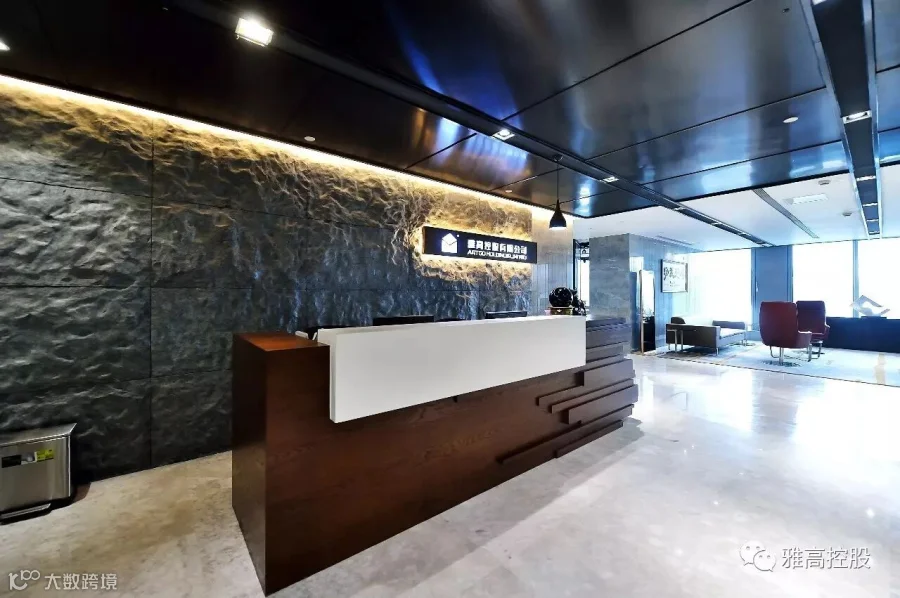 雅高控股大堂简洁、开阔,灰白色系石材辅以实木家具相得益彰,大堂内设置一面展示柜,用来展示雅高的荣誉和工艺石材,来访者一进门就能直接了解到雅高的品牌和荣誉。雅高不仅仅是一个名词或logo,它是一个文化。石材坚实,气势磅礴;木材精致,柔情内敛。
