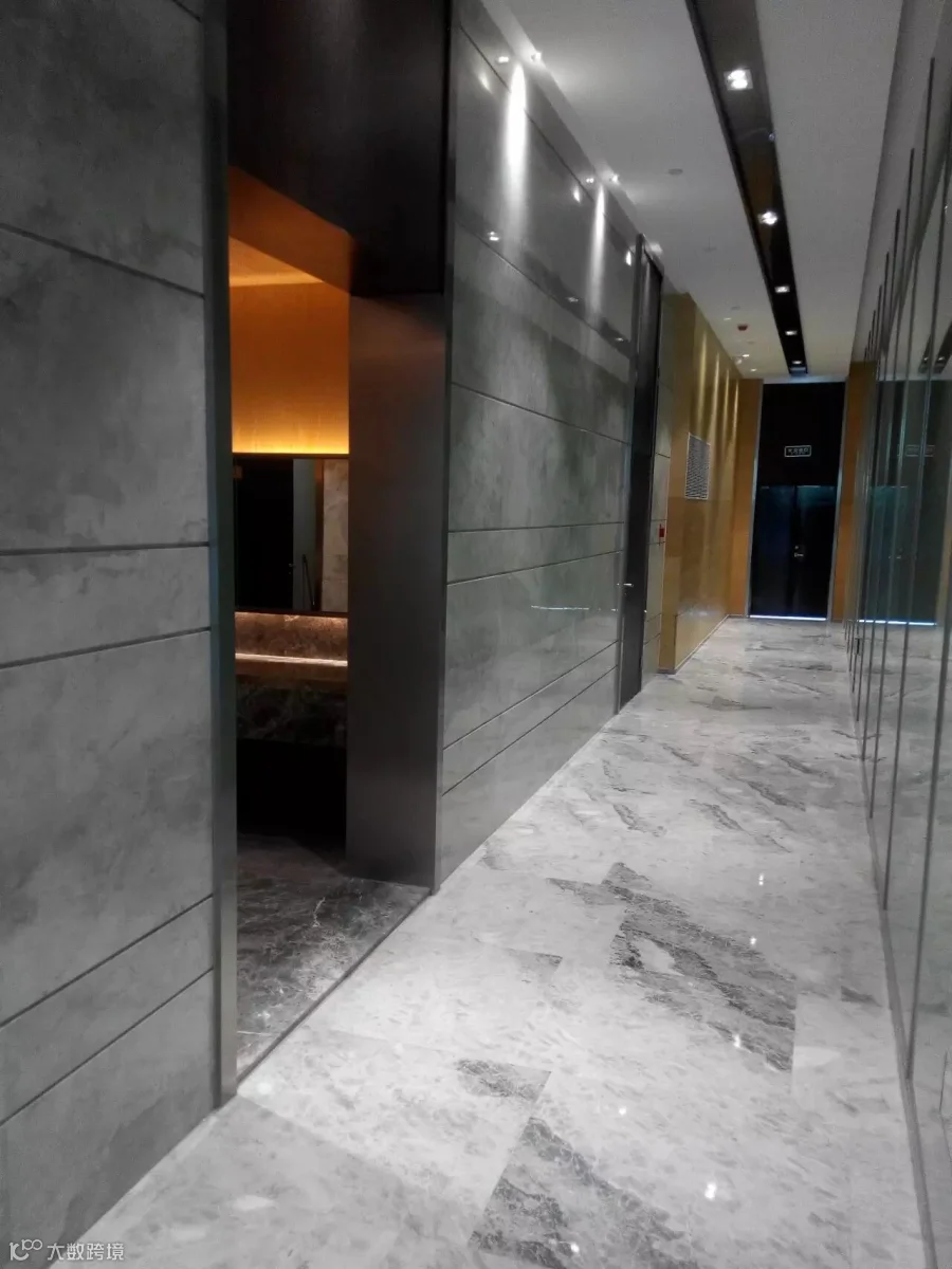 电梯走廊的地面与墙面在大理石的装饰下,仿佛被撒上了一层细致的沙,灯光映照下反射出点点光芒,就如同皎洁的月亮照耀在沙滩上的宁静恬谧。