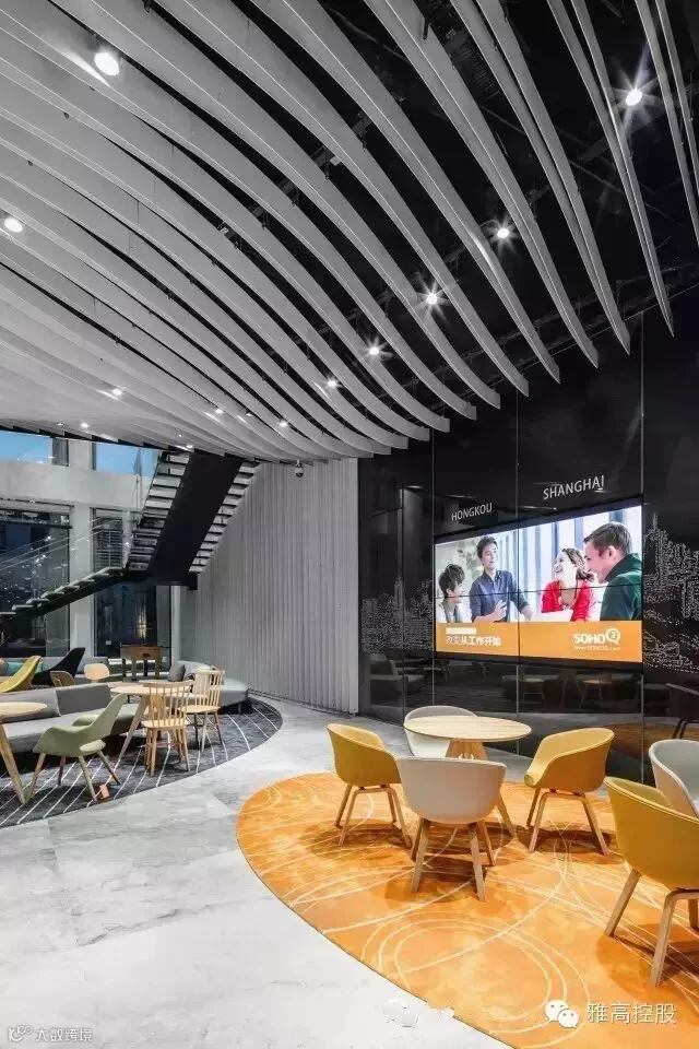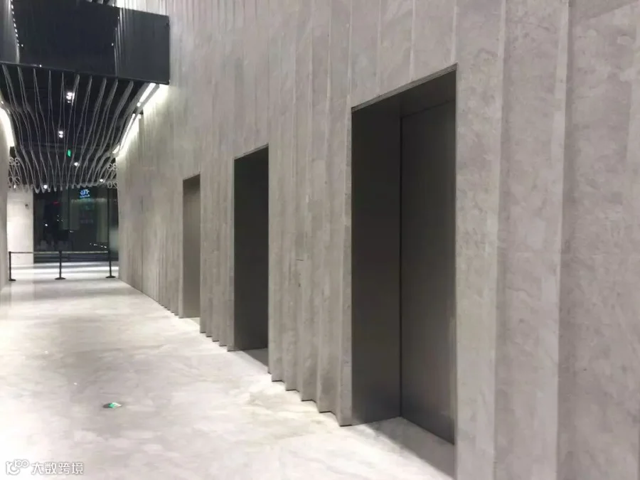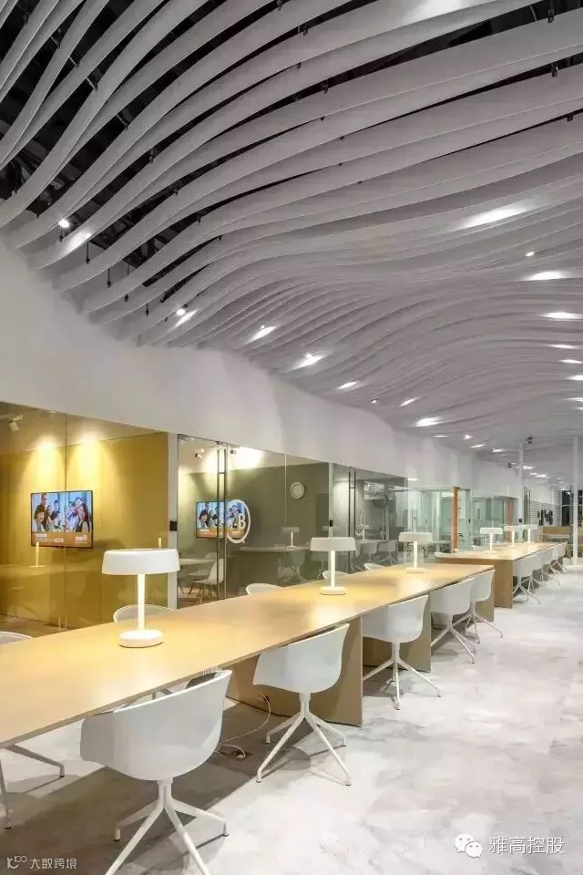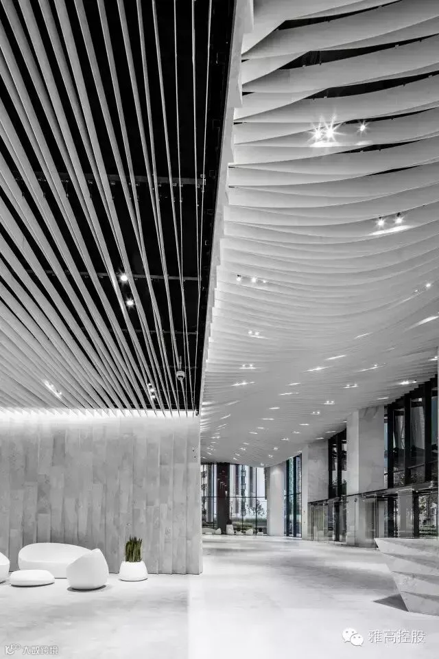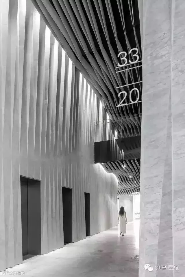 这一百叶的概念同样延续到二层裙房,从而形成一个开放式的城市空间。雅白玉、雅柏灰大理石的天然纹理与百叶造型很好的呼应起来,让行云流水般的视觉感受延伸到地面和墙面,水乳交融,整个空间从上到下,如同行云流水,一气呵成。