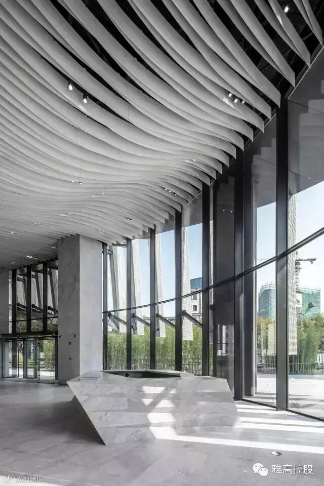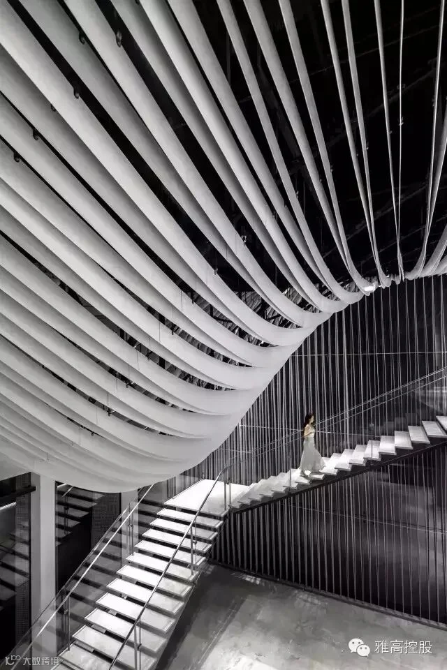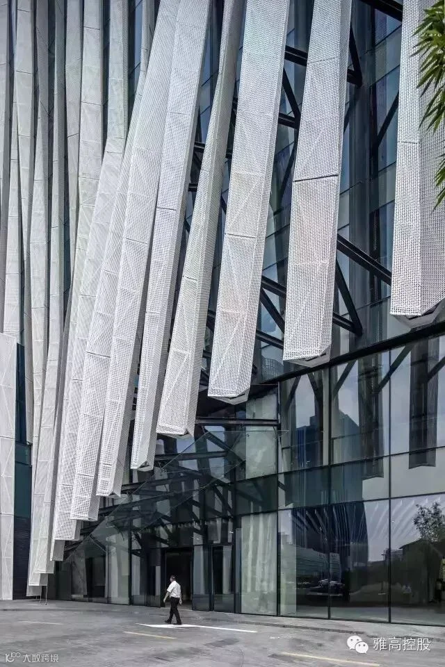 通过百叶的覆盖设计,给予建筑独特的垂直感,通过通透的材料,给予建筑不断的明暗变化。这一弯折百叶系统实际上是由三角形铝单板连接折出有机的形状,仿佛如琴弦般透过坚强而柔顺的变化覆盖建筑,优雅而又鲜明。