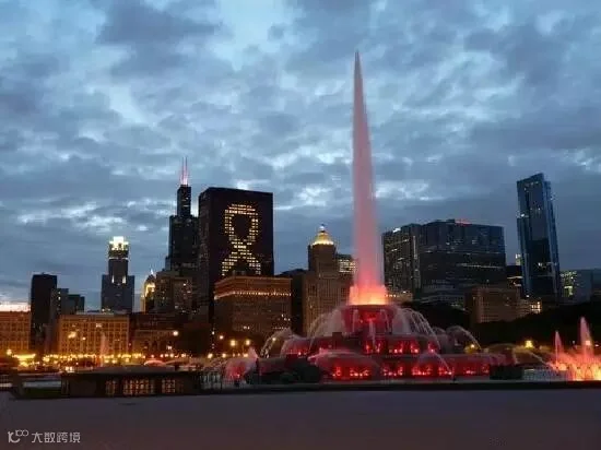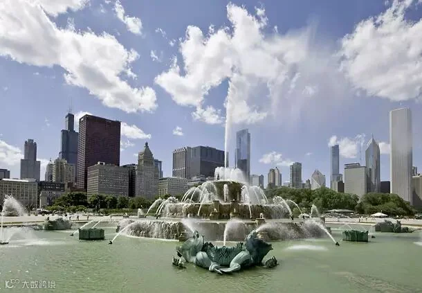 芝加哥的地标性建筑白金汉喷泉(Buckingham Fountain)建于1927年,是世界第一大照明喷泉,比法国凡尔赛宫大喷泉足足大一倍。它从四月工作到十月,在冬季,喷泉装饰着节日灯。