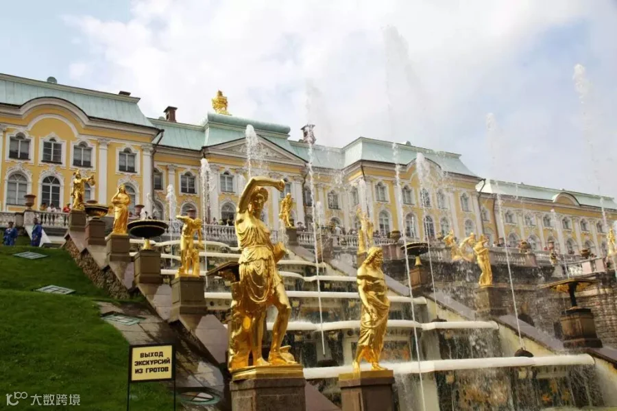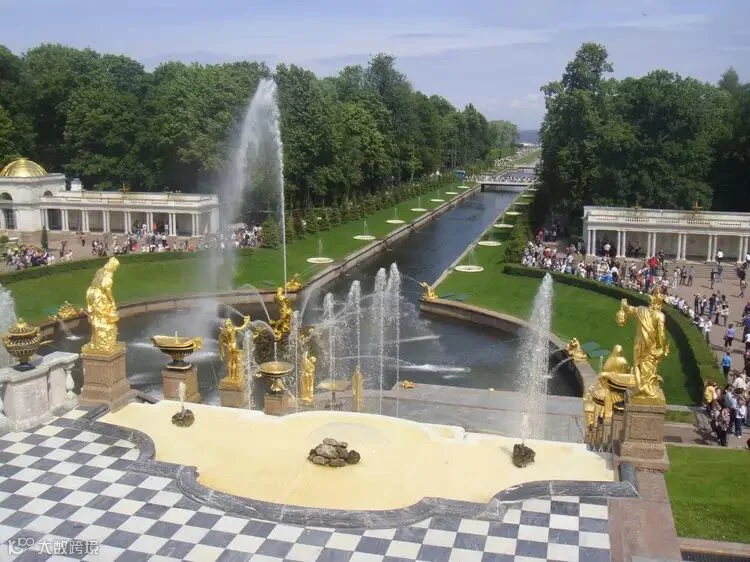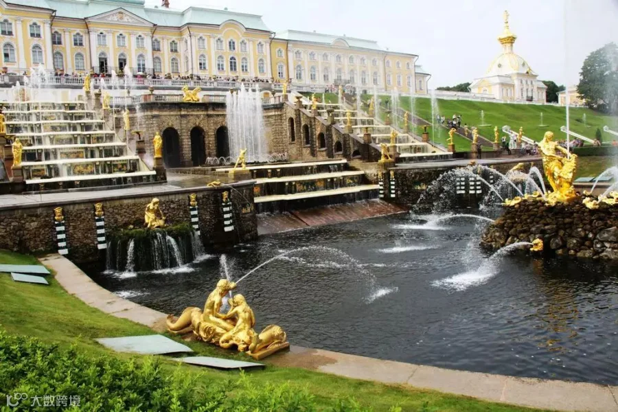 18世纪中叶,为纪念俄国在北方战争中的胜利,在“彼得大帝夏宫”的前面建造了一个由64个喷泉和250多尊金铜像组成的梯级大瀑布。
