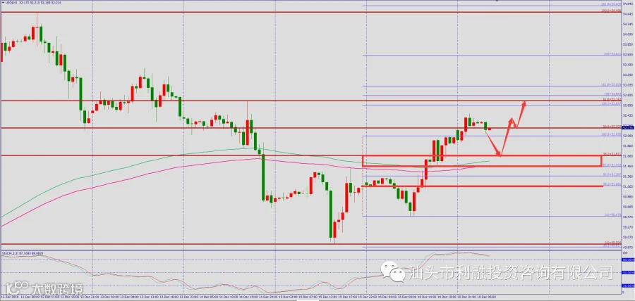 等待价格回踩51.67~51.45区域轻仓做多,以1小时K线收于51.08一线之下止损,短线目标看52.2附近,到位止盈或上移止损保本持有,第二目标看52.66附近。