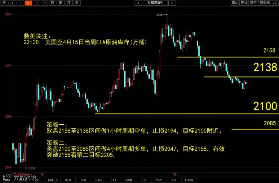 美盘2100至2085区间做4小时周期多单,止损2047,目标2158,有效突破2158看第二目标2205。
