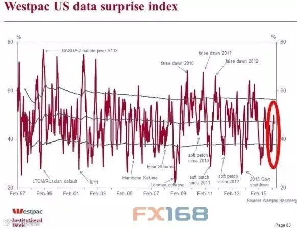 Franulovich向投资者展示了以下的西太平洋美国数据意外指数(Westpac’s US data surprise index),下图表明,随着数据趋势继续改善,则该指数可能会延续升势。