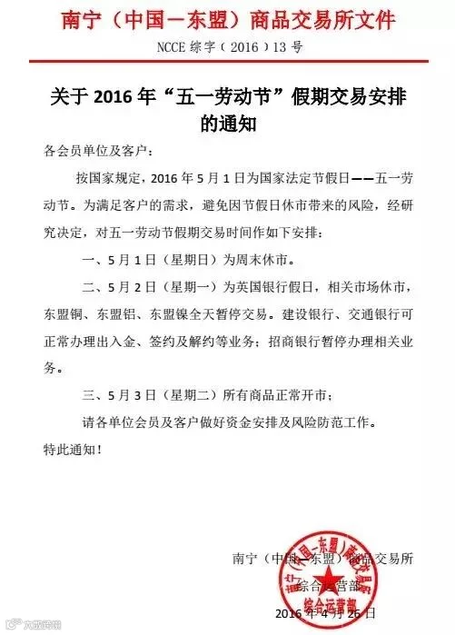 以下是南宁(中国——东盟)商品交易所关于2016年“五一劳动节”假期交易安排的通知,请各位客户知悉!4月30日、5月1日为周末休市,5月2日东盟铜、东盟铝、东盟镍全天暂停交易。建设银行、交通银行可正常办理出入金、签约及解约等业务;招商银行暂停办理相关业务。5月3日所有商品正常开市。