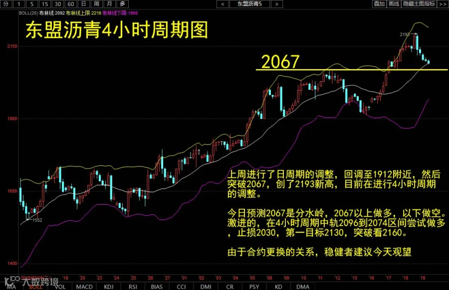上周进行了日周期的调整,回调至1912附近,然后突破2067,创了2193新高,目前在进行4小时周期的调整。
