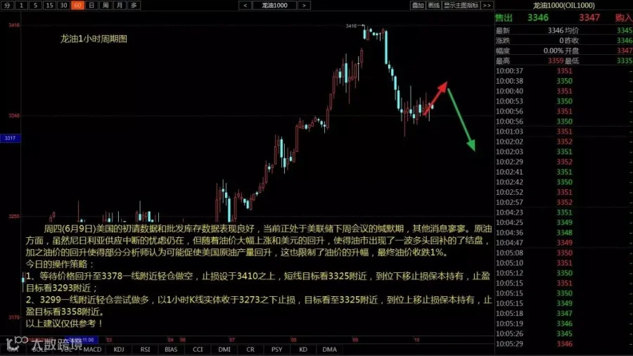2、3299一线附近轻仓尝试做多,以1小时K线实体收于3273之下止损,目标看至3325附近,到位上移止损保本持有,止盈目标看3358附近。