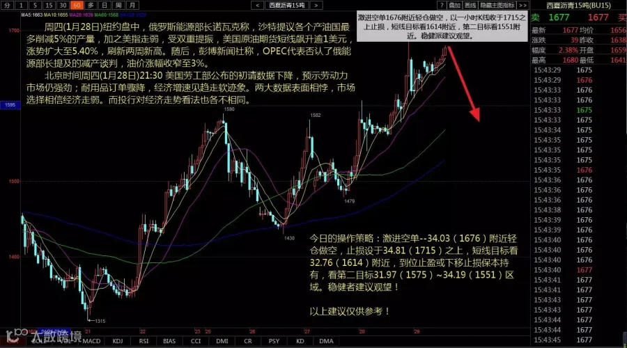 今日的操作策略:激进空单--34.03(1676)附近轻仓做空,止损设于34.81(1715)之上,短线目标看32.76(1614)附近,到位止盈或下移止损保本持有,看第二目标31.97(1575)~34.19(1551)区域。稳健者建议观望!