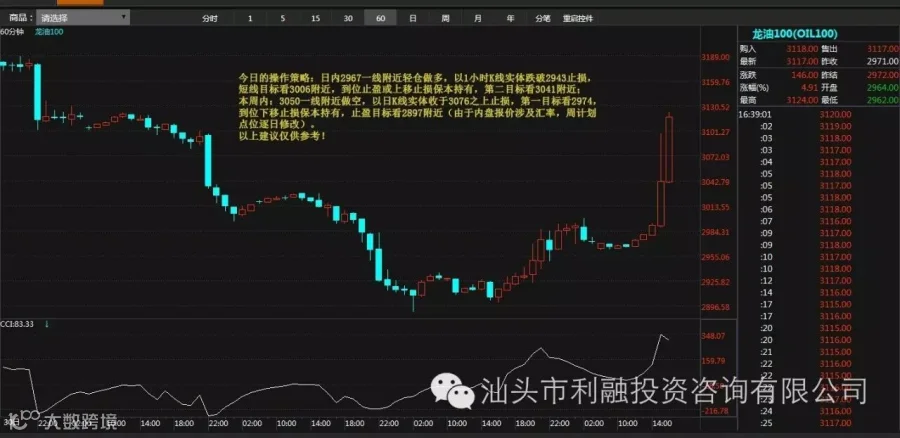 日内2967一线附近轻仓做多,以1小时K线实体跌破2943止损,短线目标看3006附近,到位止盈或上移止损保本持有,第二目标看3041附近;本周内:3050一线附近做空,以日K线实体收于3076之上止损,第一目标看2974,到位下移止损保本持有,止盈目标看2897附近(由于内盘报价涉及汇率,周计划点位逐日修改)。