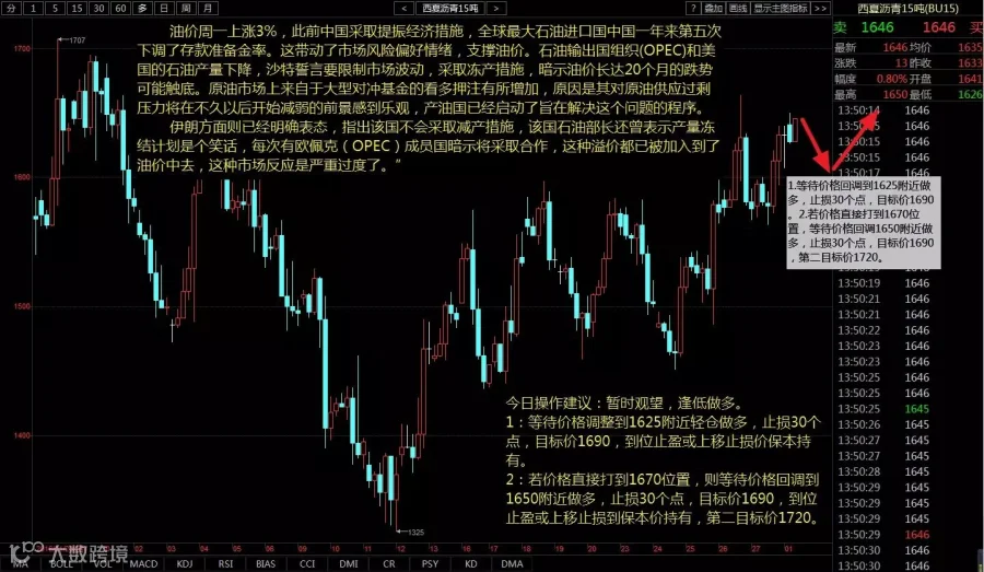 2:若价格直接打到1670位置,则等待价格回调到1650附近做多,止损30个点,目标价1690,到位止盈或上移止损到保本价持有,第二目标价1720。