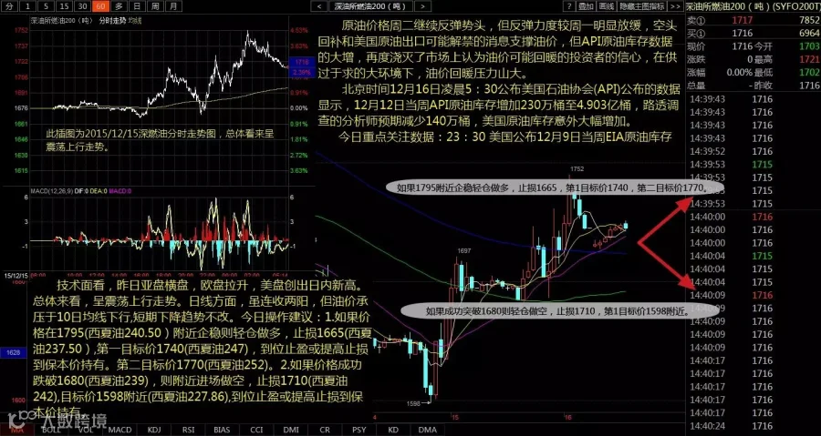 1.如果价格在1695(西夏油240.50)附近企稳则轻仓做多,止损1665(西夏油237.50),第一目标价1740(西夏油247),到位止盈或提高止损到保本价持有。第二目标价1770(西夏油252);