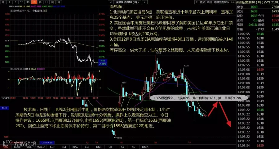技术面:日线上,K线2连阳随后中阴,价格两次挑战10日均线均受到压制,1小时周期受5日均线压制缓慢下行,说明短线走势十分弱势。操作上以逢高做空为主。