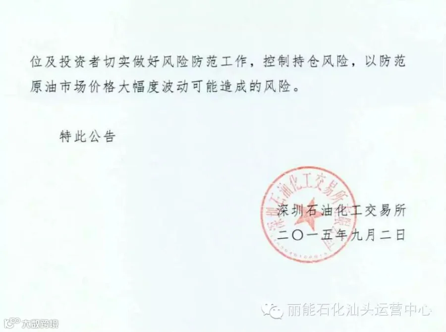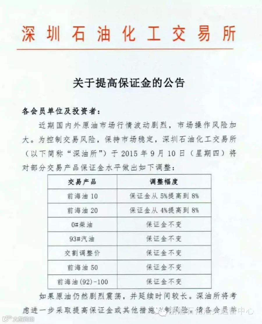 深油所现已完成前海油10和前海油20的保证金比例调整(参见2015年9月2日《关于提高保证金的公告》),预计于2015年9月11日早上结算时生效。届时所有持仓前海油10和前海油20的投资者占用保证金将会重新计算,包括未平仓的历史持仓和新建仓。
