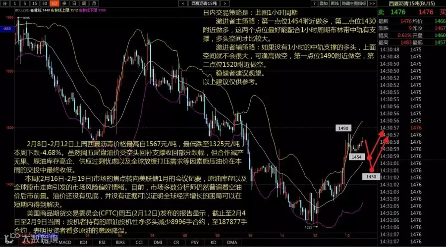 激进者主策略:第一点位1454附近做多,第二点位1430附近做多,这两个点位最好能配合1小时周期布林带中轨有支撑,多头空间才比较大。
